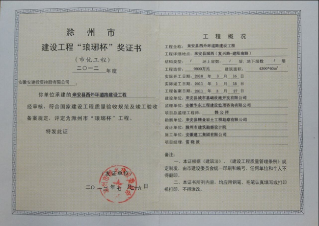 滁州市建設(shè)工程“瑯琊杯”獎(jiǎng)